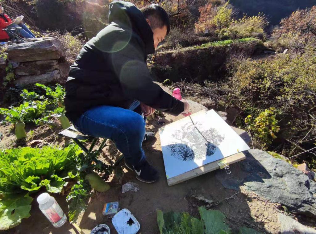 雄伟壮丽的太行山、石头垒成的石屋、造型独特的树木充分激发了师生们的写生和创作欲望,大家迅速地投入到了紧张有序的写生活动。写生前两天,由杨巍、邓欢华两位老师带领大家选取景点,示范山石、树木、房屋技法,并亲自为员工讲解示范。从第三天开始,两位老师继续带领员工出去写生,上午8点10分出发,11点40返回住地,下午13点出发,4点30返回住地,晚上检查大家的作业,每天的课程都非常充实。同时,老师把每天的写生作业发到群里给员工,让员工学习参考。山水画写生有一定的难度,特别是在取景构图和笔墨运用上。但经过一周的练习,大家都逐步进入状态,个别员工的作品非常出色。