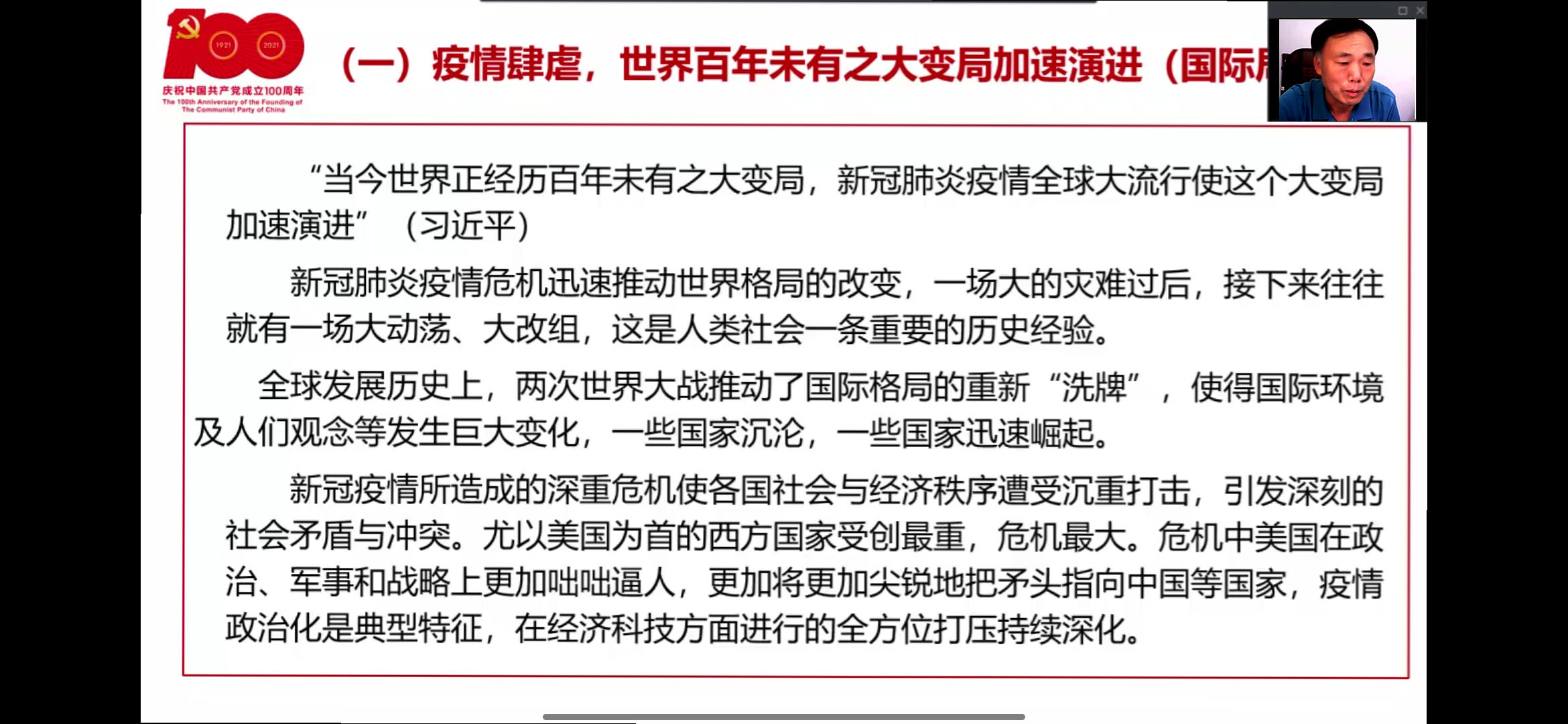 会上,刘立宁书记首先领学了习近平总书记在庆祝中国共产党成立100 周年大会上的重要讲话,然后围绕“时机特殊 意义重大”、“丰功伟绩 恢宏史诗”、“精神血脉 代代相传”、“以史为鉴 开创未来”、“学深悟透 知行合一”五个角度,从深入分析国际国内背景、深入理解中国共产党百年来创造的“四个伟大成就”和向世界作出的“四个庄严宣言”、深入领会伟大建党精神等方面进行了宣讲,为全体教职工上了一堂精彩的思政课。