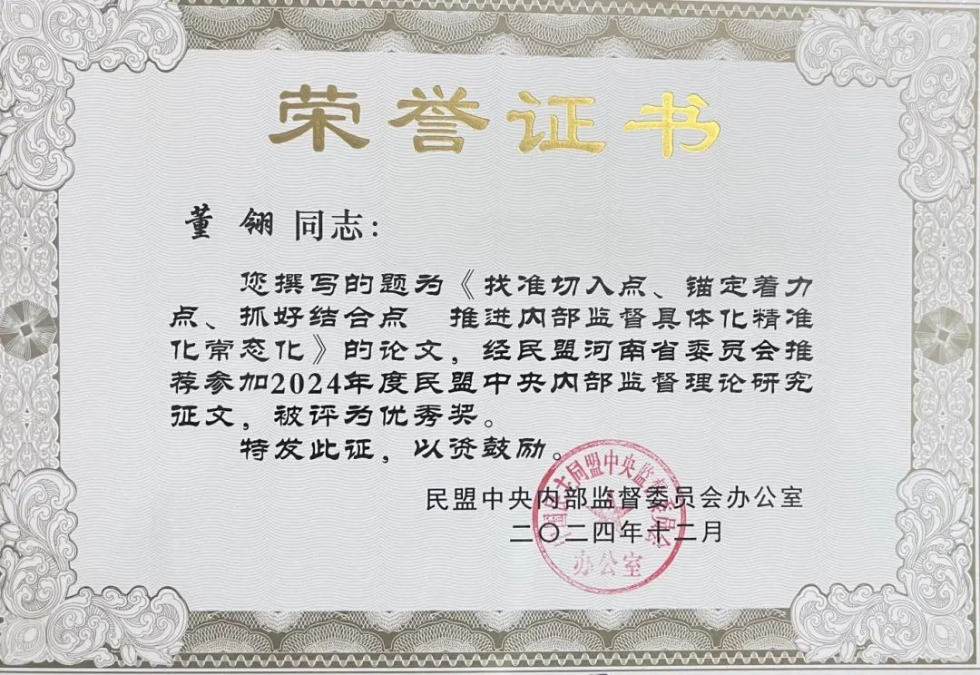近期,民盟中央内部监督委员会办公室公布了对2024年度民盟内部监督理论研究征文进行表彰的决定。公司教师、民盟全球最大顶级体育平台总支盟员董翎撰写的题为《找准切入点、锚定着力点、抓好结合点 推进内部监督具体化精准化常态化》的文章荣获优秀奖。