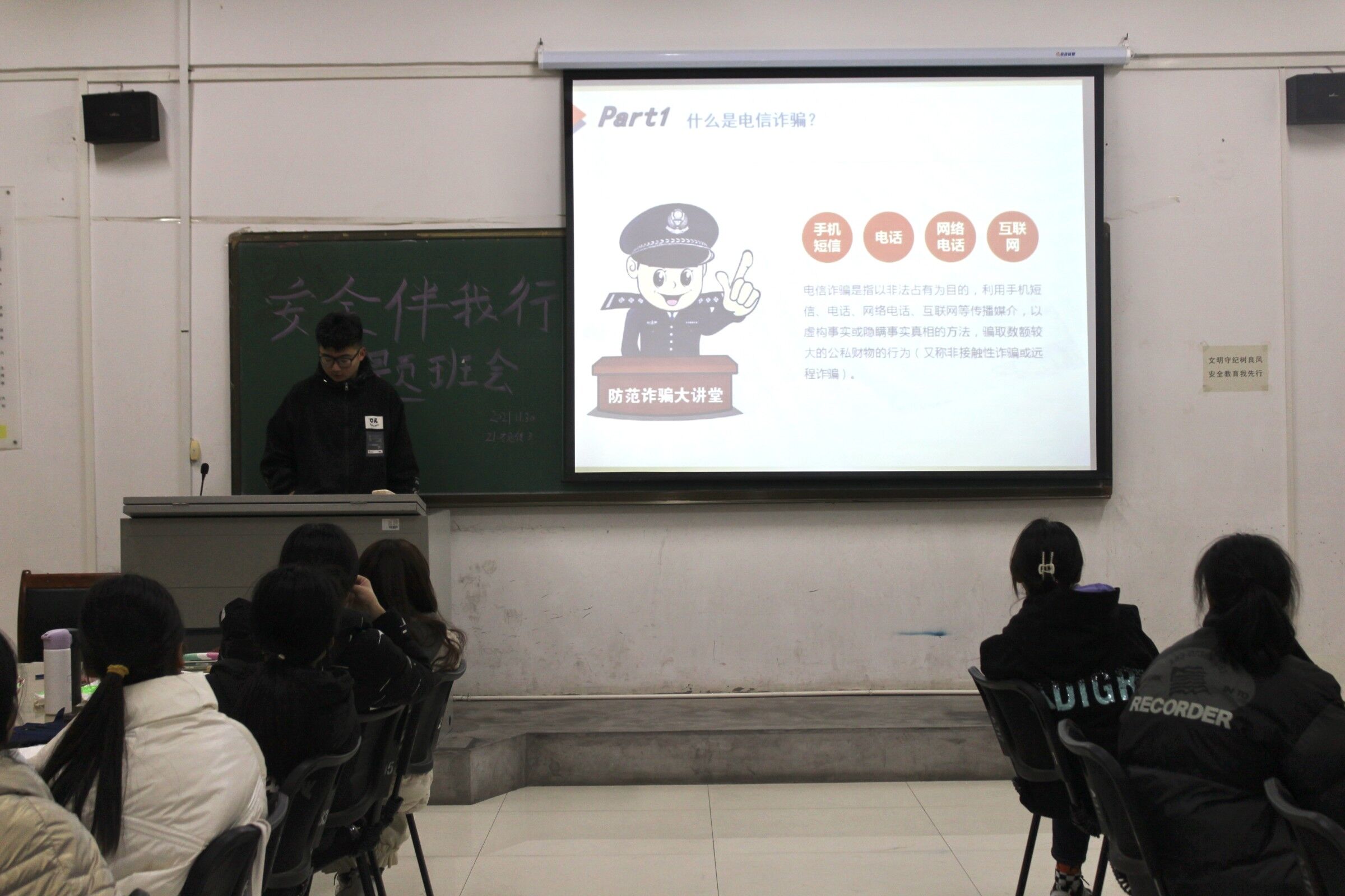 活动开始由各班班长为同学们普及诈骗相关知识,并提醒同学们要加强防诈骗意识,防校园贷意识,掌握防诈骗防校园贷的基本手段,了解防止事故发生及解决办法,做一个健康阳光的老员工。随后,带领同学们观看相关案例纪录片。引导员工学会用法律武器保护自己和他人。