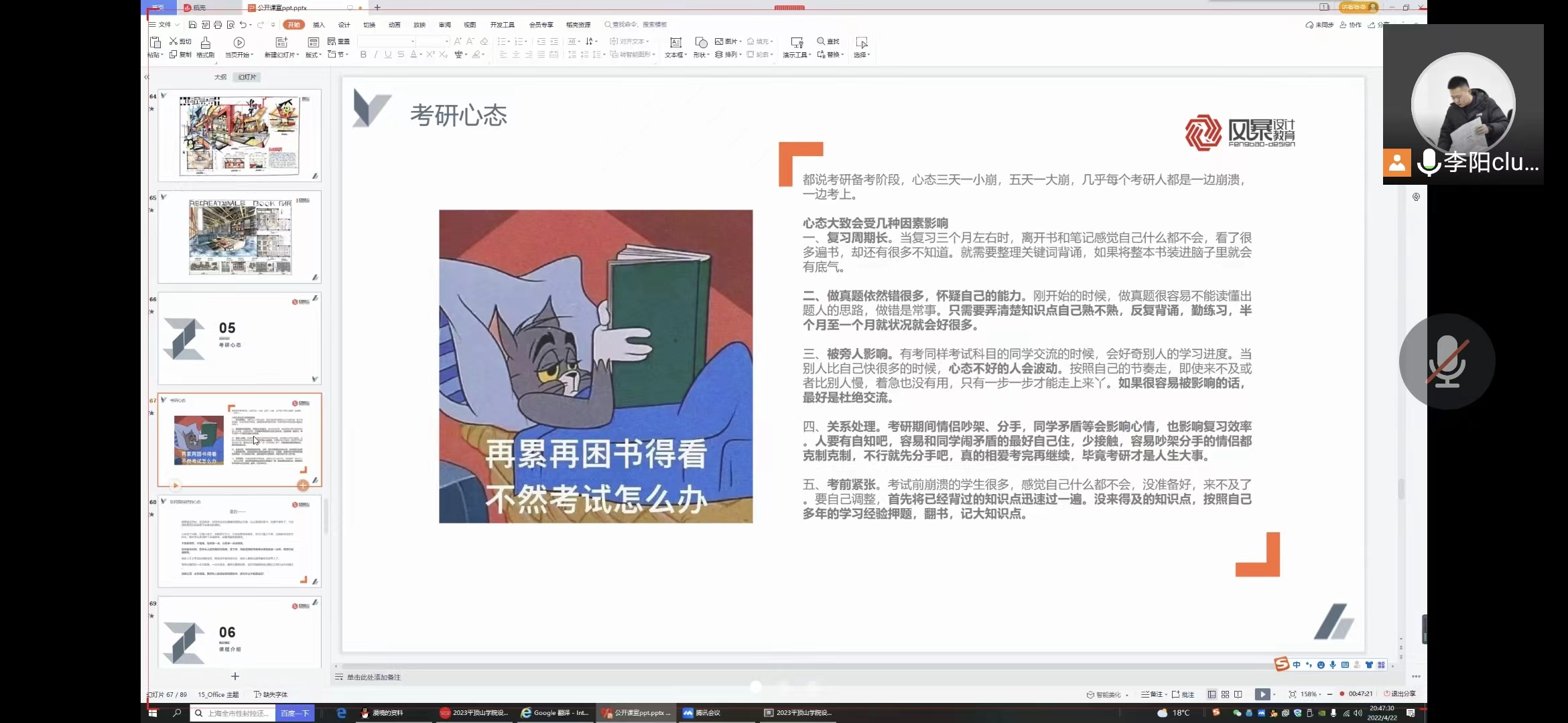 讲座伊始,李阳老师从历届全国艺术设计学研究生录取数据以及近三年考研数据进行分析,让同学们了解当前的考研形势。随后,李阳老师对考研学习中快题学习方法、考研各科复习方法,以及复试过程中的注意事项等方面进行交流。李阳老师耐心地解答同学们的困惑,并鼓励同学们提前谋划,抓住先机,努力拼搏,争取考研成功。