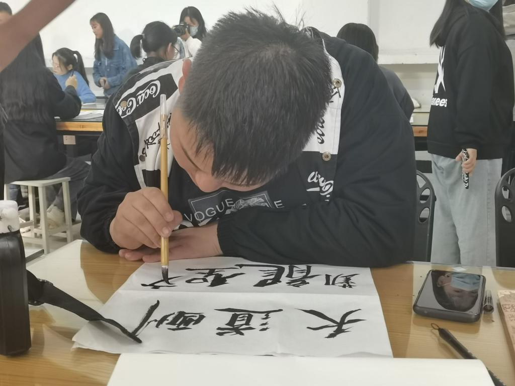 活动伊始,负责人胡东明为同学们分享了书法的历史、书法的内容和分类以及书法的学习方法。随后,胡东明现场示范楷书、行书、隶书、草书等书写方式和技巧,激起同学们对书法的兴趣,使同学们进一步了解和学习书法知识。最后,同学们进行实际操作,用心书写每一笔笔画、每一个汉字,尽其所能地展现自身书法才能。