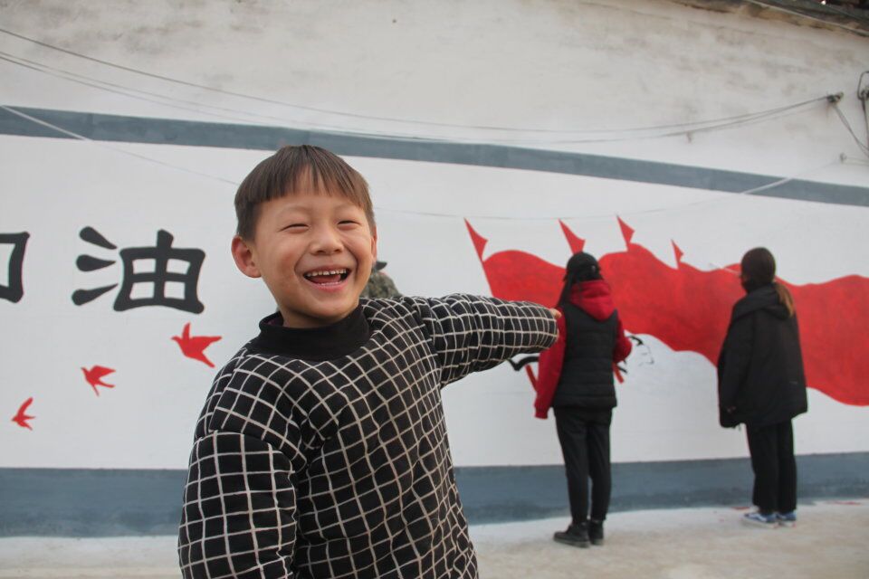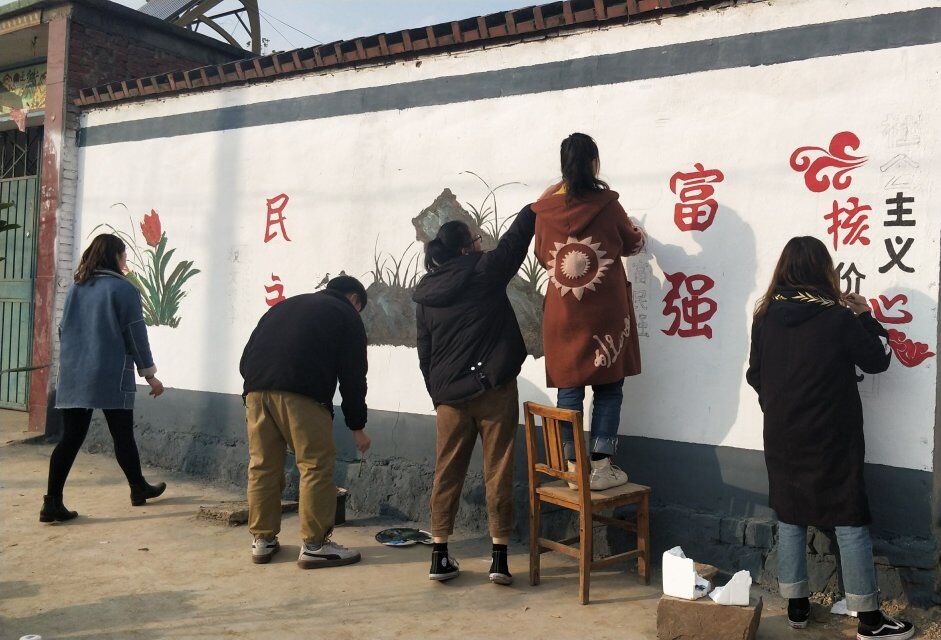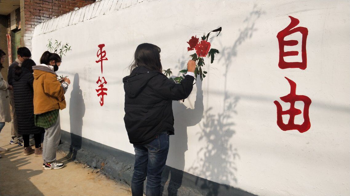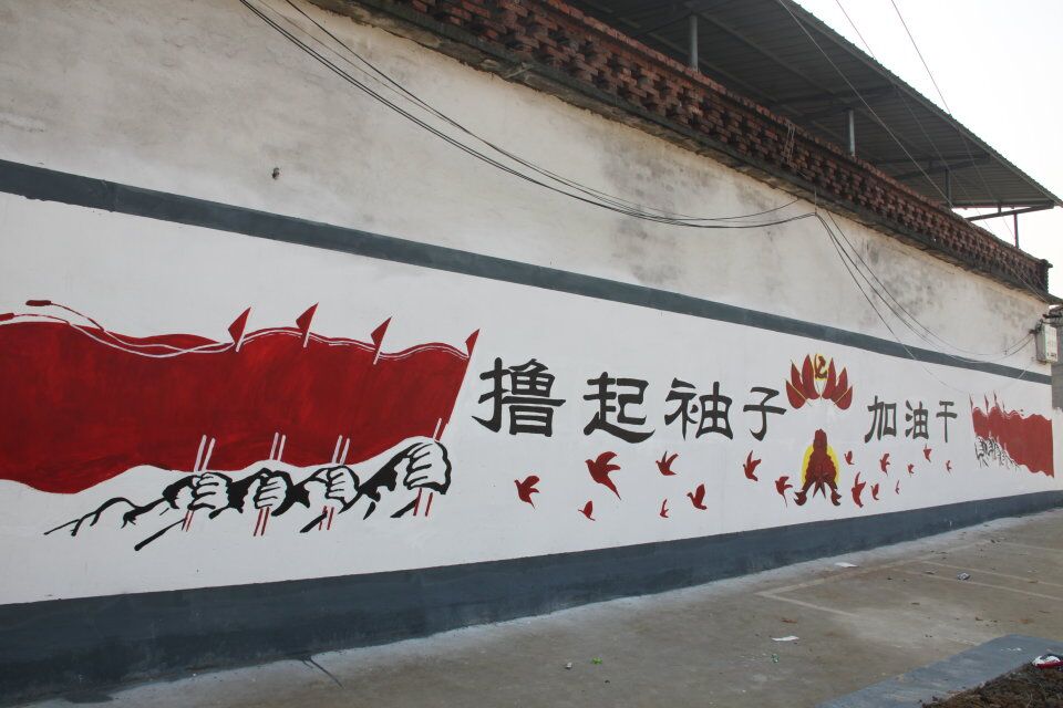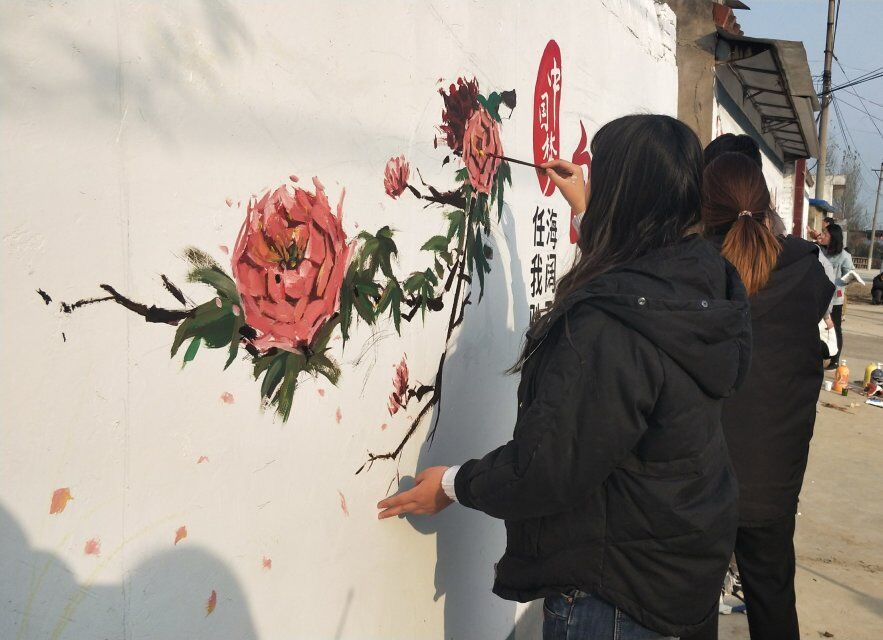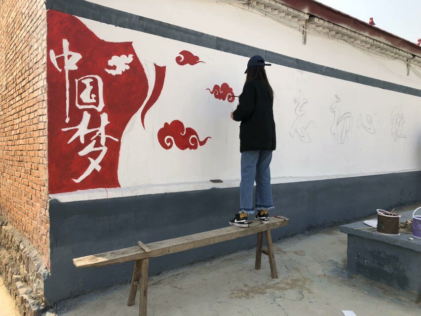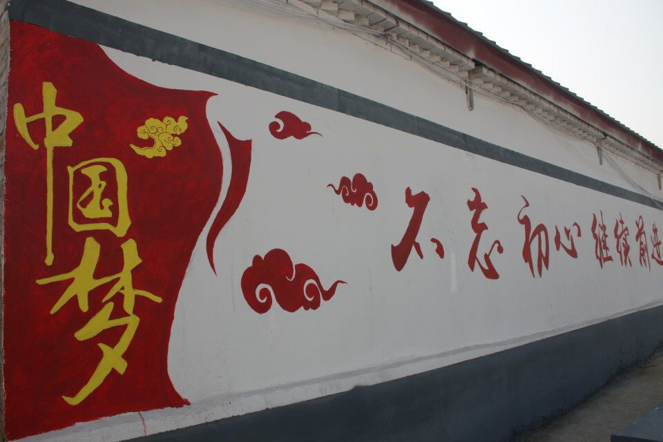 经过前期准备的现场考察、志愿者们利用该村庄空置的墙面,以富有中国特色的图案为内容在墙体上绘画。一幅幅 “撸起袖子加油干”、“社会主义核心价值观”、“脱贫攻坚”等主题的标语、漫画和风景画,辉映在乡村里的白墙灰瓦间,扮靓原本斑驳的墙面。