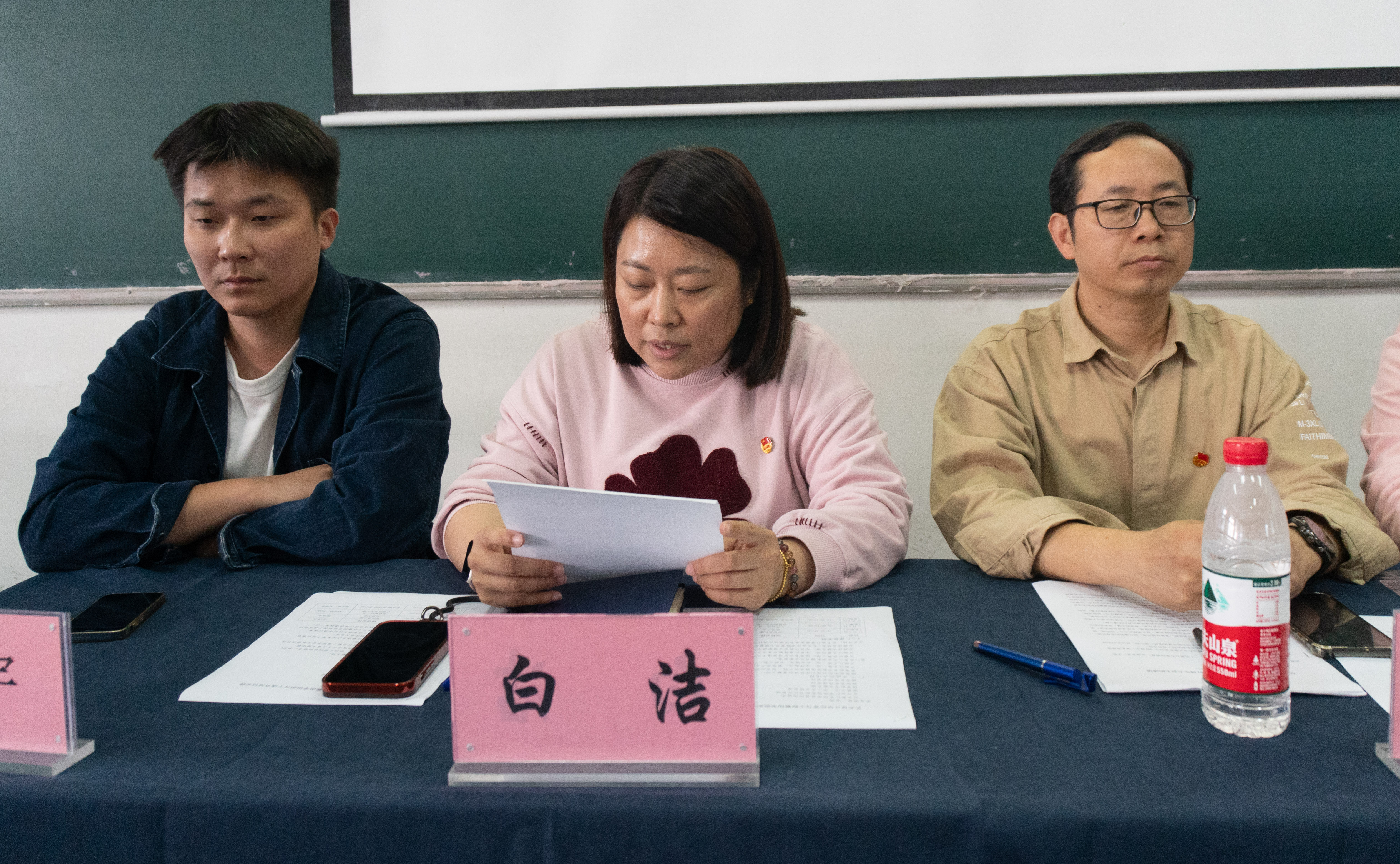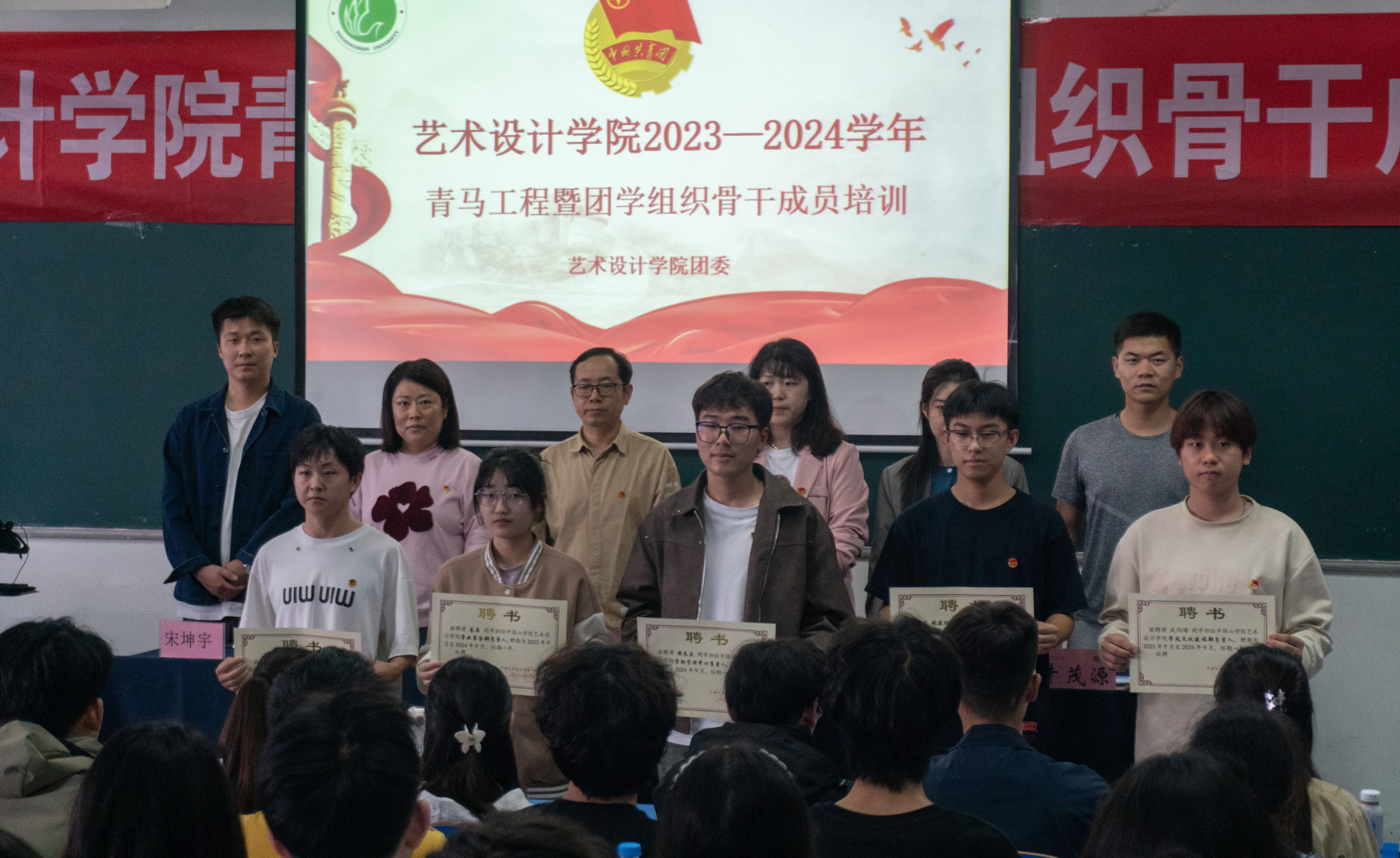 赵依晗宣读新一届团学会主席团成员名单,参会老师为新一届团学会主席团成员颁发聘书。