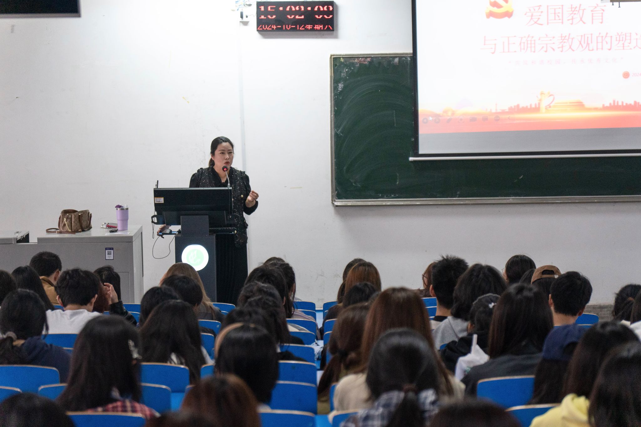 白洁从爱国主义教育的内涵及重要性、正确宗教观的内涵和爱国主义教育与宗教观的融合等方面开展,结合身边实事、历史发展和当今国际形势,深入剖析树立正确宗教观的重要性,并从宗教的本质和来源及中国共产党的宗教政策等方面进行了学习,引导同学们树立正确的宗教观,认真辨别宗教与科学的区别,认清邪教和封建迷信的本质,从而更加坚定同学们的理想信念,增强同学们担当民族复兴重任的责任感和使命感。