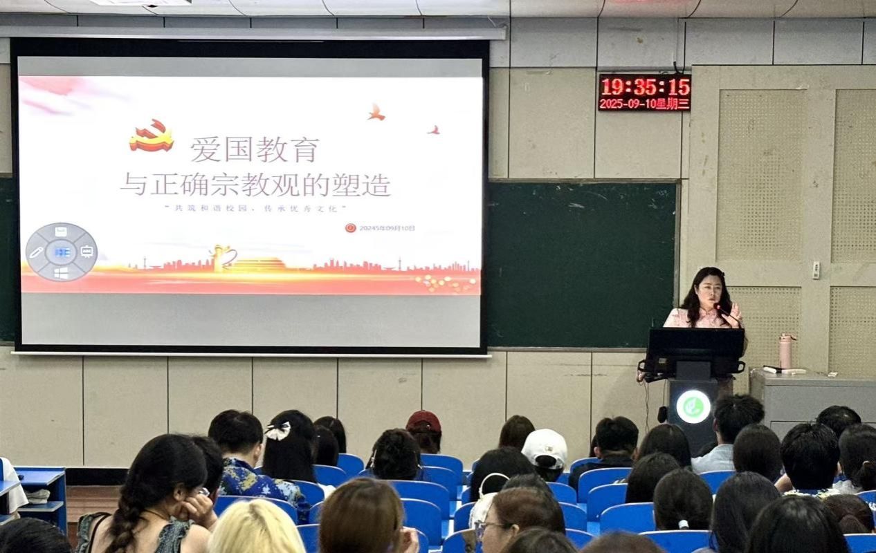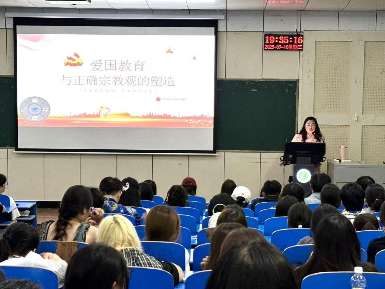 白洁从爱国主义教育的内涵及重要性、正确宗教观的核心要义、爱国主义教育与宗教观的融合等方面开展,结合身边实事、历史发展和当今国际形势,深入分析树立正确宗教观的重要性。随后,对宗教本质和来源方面进行学习,帮助同学们辨别宗教与科学的区别,认清邪教和封建迷信的本质,从而更加坚定同学们的理想信念,增强同学们担当民族复兴重任的责任感和使命感。
