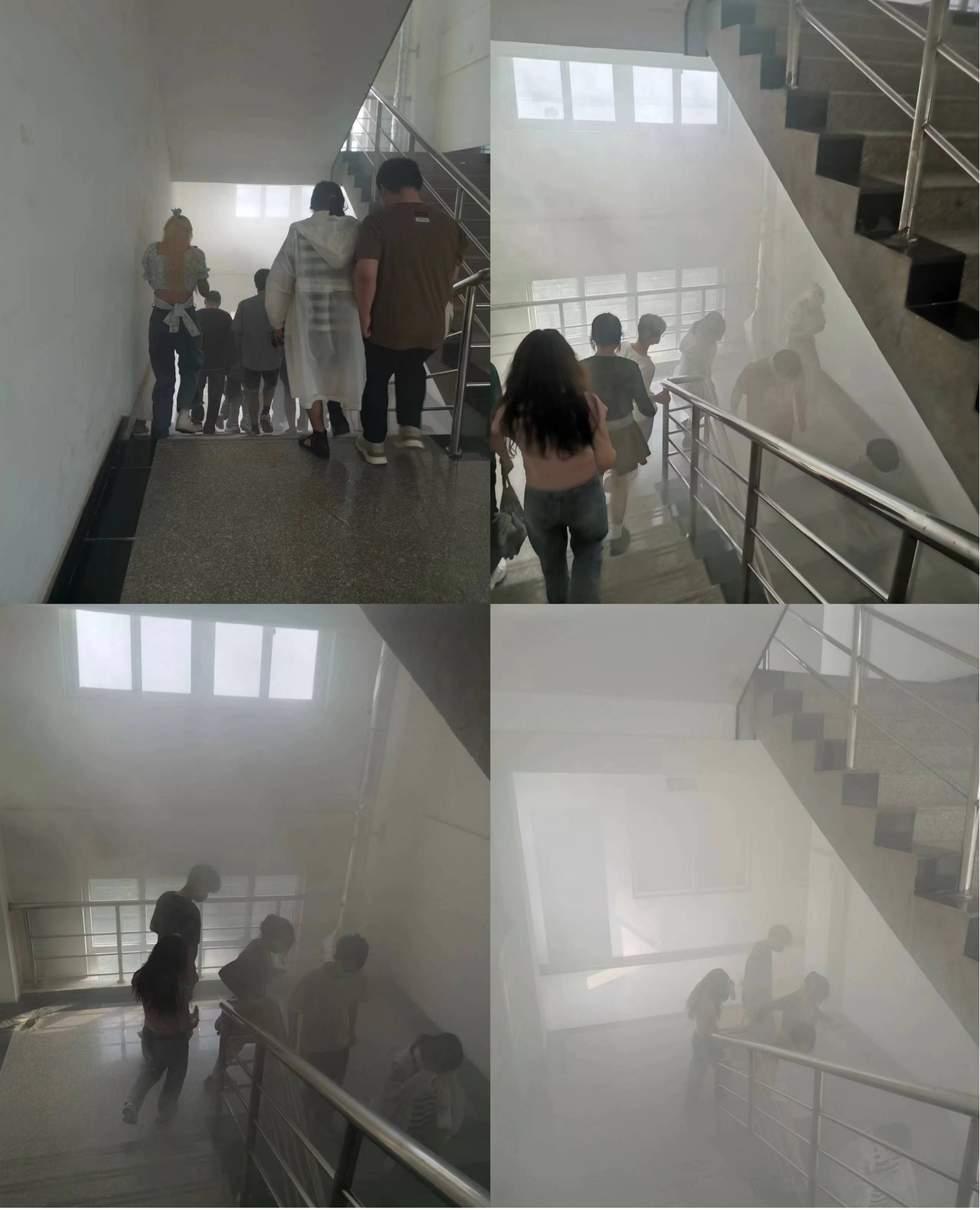 同学们捂住口鼻,压低身体,保持冷静,行动迅速,按照指定逃生路线有序撤离。