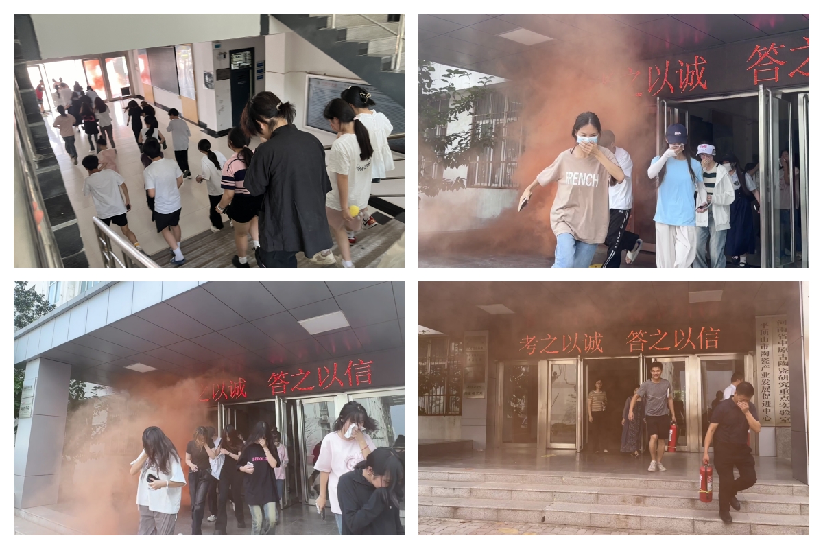 演练分为两个环节。首先,是火灾报警与应急响应、人员疏散与逃生演练。随着警铃的尖锐响起,A317教室内的员工们迅速从前后门有序撤离。在模拟的烟雾环境中,由班干部和老师组成的疏导员队伍迅速到位,指导员工们捂住口鼻、低头弯腰,按照指定路线迅速撤离至安全区域。整个疏散过程有条不紊,充分展现了师生们出色的应急逃生意识和团队协作能力。