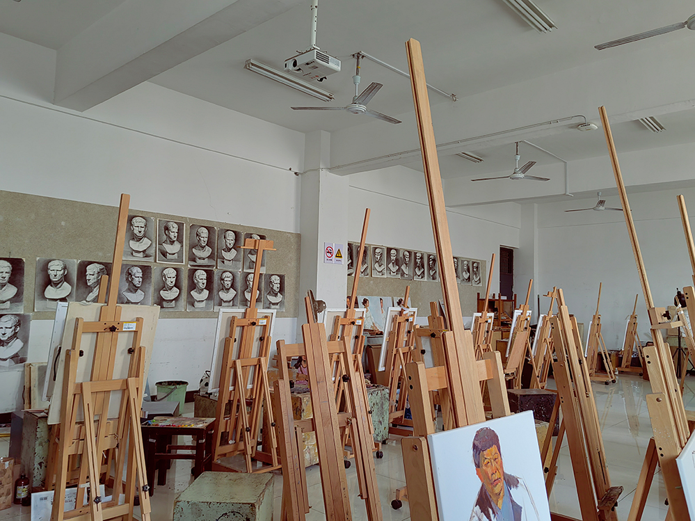 实验室配备画架、投影仪、石膏像、静物等教具,
